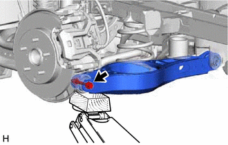 | (a) Install the rear No. 2 suspension arm assembly (rear axle carrier sub-assembly side) with the bolt. Torque: 73 N·m {744 kgf·cm, 54 ft·lbf} NOTICE: Because the nut has its own stopper, do not turn the nut. Tighten the bolt with the nut secured. |