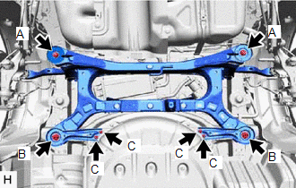 | (d) Install the rear suspension member sub-assembly with the 2 rear suspension member lower stoppers, rear suspension member lower brace LH and rear suspension member lower brace RH, 2 bolts and 6 nuts. Torque: Bolt A : 158 N·m {1611 kgf·cm, 117 ft·lbf} Nut B : 158 N·m {1611 kgf·cm, 117 ft·lbf} Nut C : 18 N·m {184 kgf·cm, 13 ft·lbf} |