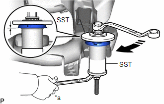 | (b) Install SST as shown in the illustration. SST: 09570-24011 SST: 09830-10010 09830-01010 09830-01020 09830-01040 09830-01050 NOTICE: Apply molybdenum grease to the threads and tip of the SST center bolt before use. |