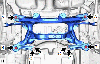 | (d) Install the rear suspension member sub-assembly with the 2 rear suspension member lower stoppers, rear suspension member lower brace LH and rear suspension member lower brace RH, 2 bolts and 6 nuts. Torque: Bolt A : 158 N·m {1611 kgf·cm, 117 ft·lbf} Nut B : 158 N·m {1611 kgf·cm, 117 ft·lbf} Nut C : 18 N·m {184 kgf·cm, 13 ft·lbf} |