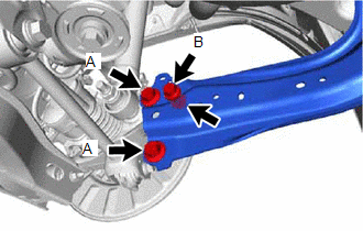 | (1) Install the rear trailing arm assembly to the rear axle carrier sub-assembly with the 3 bolts and nut. Torque: Bolt (A) : 135 N·m {1377 kgf·cm, 100 ft·lbf} Bolt (B) : 75 N·m {765 kgf·cm, 55 ft·lbf} |