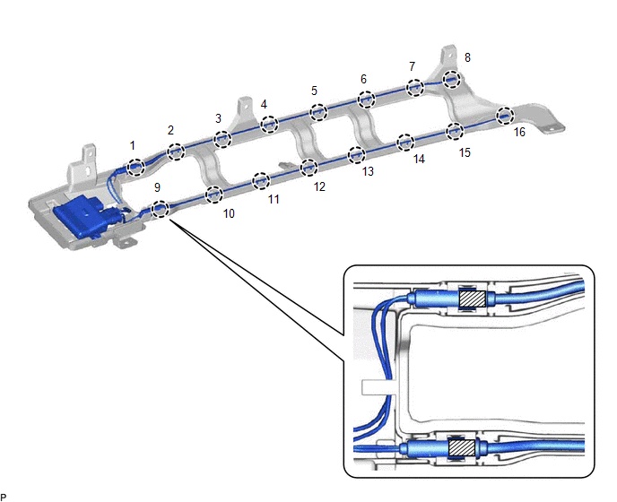 (c) Engage the 16 claws with each marking on the kick door control sensor facing up to install the kick door control sensor as shown in the illustration.