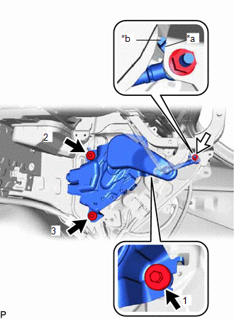 | (d) Install the luggage closer motor assembly with the 3 bolts. HINT: Tighten the bolts in the order shown in the illustration. Torque: 5.5 N·m {56 kgf·cm, 49 in·lbf} |