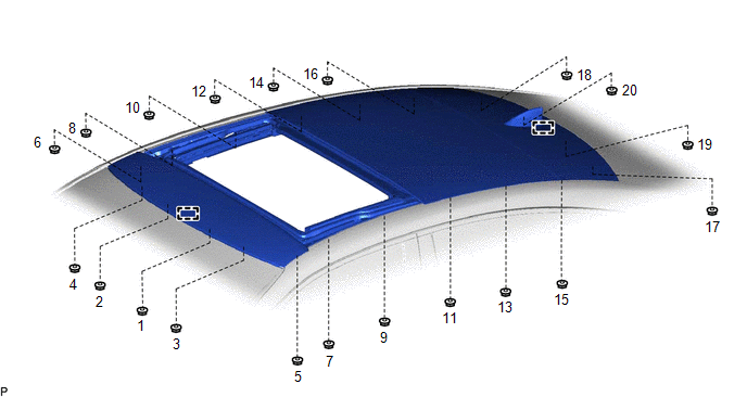 (d) Tighten the 20 nuts to install the sliding roof or removable roof housing sub-assembly.