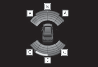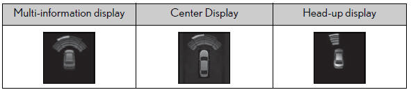 ■ Display When the sensors detect an object, such as a wall, a graphic is shown on the multi-information display, head-up display (if equipped) and Center Display depending on the position and distance to the object.