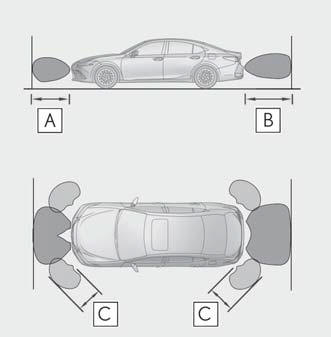 The diagram shows the detection range of the sensors. Note that the sensors cannot detect objects that are extremely close to the vehicle.