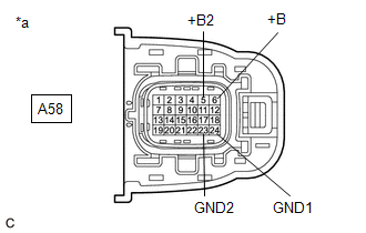 | A58-5 (+B2) - Body ground | Power switch on (IG) | Same as auxiliary battery voltage |