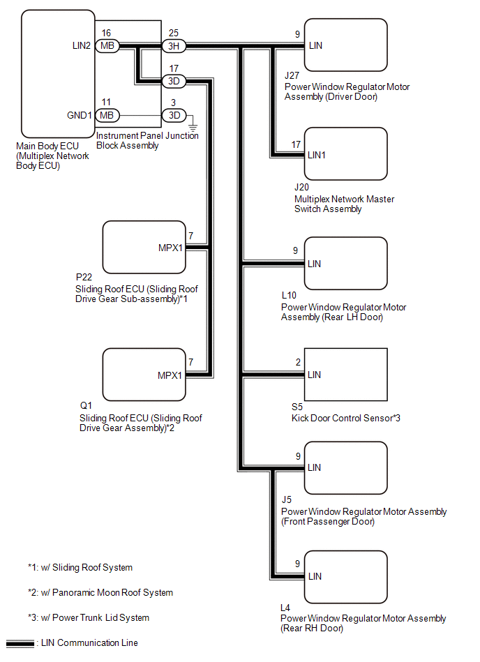This inspection is to check the LIN communication line in the instrument panel junction block assembly that connects the wire harness to the built-in main body ECU (multiplex network body ECU).