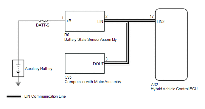 The hybrid vehicle control ECU communicates with the battery state sensor assembly via LIN communication. If a LIN communication error is detected, the hybrid vehicle control ECU stores this DTC.