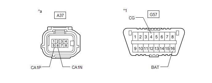 | A37-5 (CA1P) - G57-16 (BAT) | Cable disconnected from negative (-) auxiliary battery terminal | 6 kΩ or higher |
