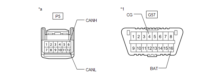 | P5-12 (CANL) - G57-16 (BAT) | Cable disconnected from negative (-) auxiliary battery terminal | 6 kΩ or higher |