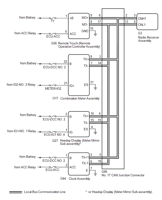 These DTCs are stored when communication between the radio receiver assembly and remote touch (remote operation controller assembly), combination meter assembly, headup display (meter mirror sub-assembly)* or clock assembly is not possible.