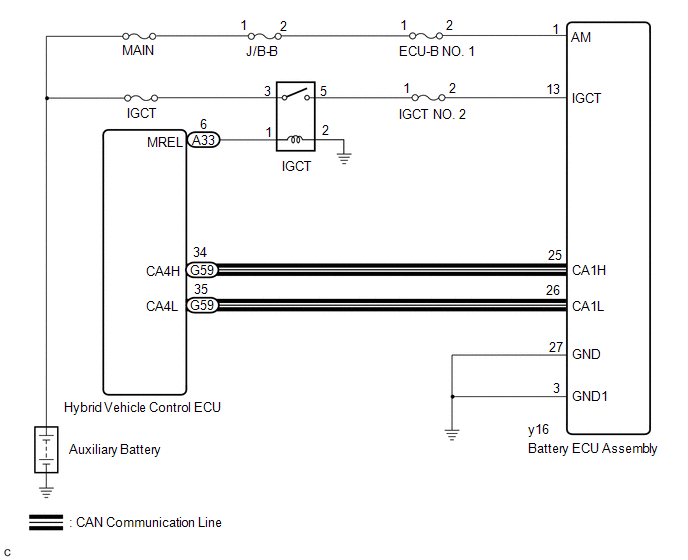 The hybrid vehicle control ECU transmits and receives signals via CAN communication to and from the battery ECU assembly.
