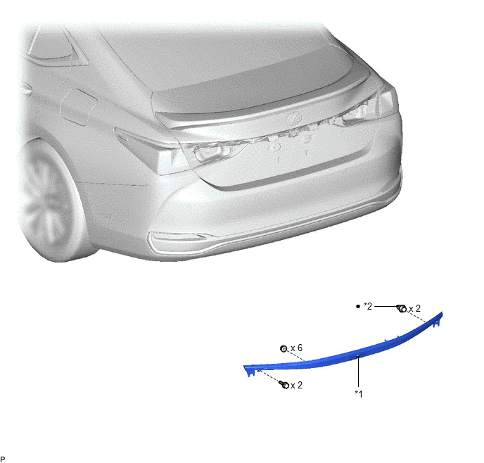 | *1 | LUGGAGE COMPARTMENT DOOR OUTSIDE GARNISH SUB-ASSEMBLY | *2 | CLIP |