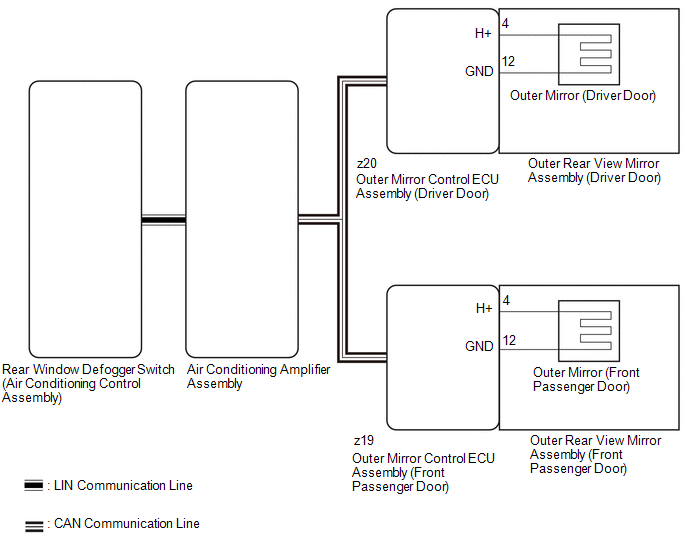 When the mirror heater switch (rear window defogger switch) is operated, the mirror heater signal is sent to the air conditioning amplifier assembly and then to each outer mirror control ECU assembly via CAN communication. Based on this signal, the outer mirror control ECU assemblies operate the mirror heaters.