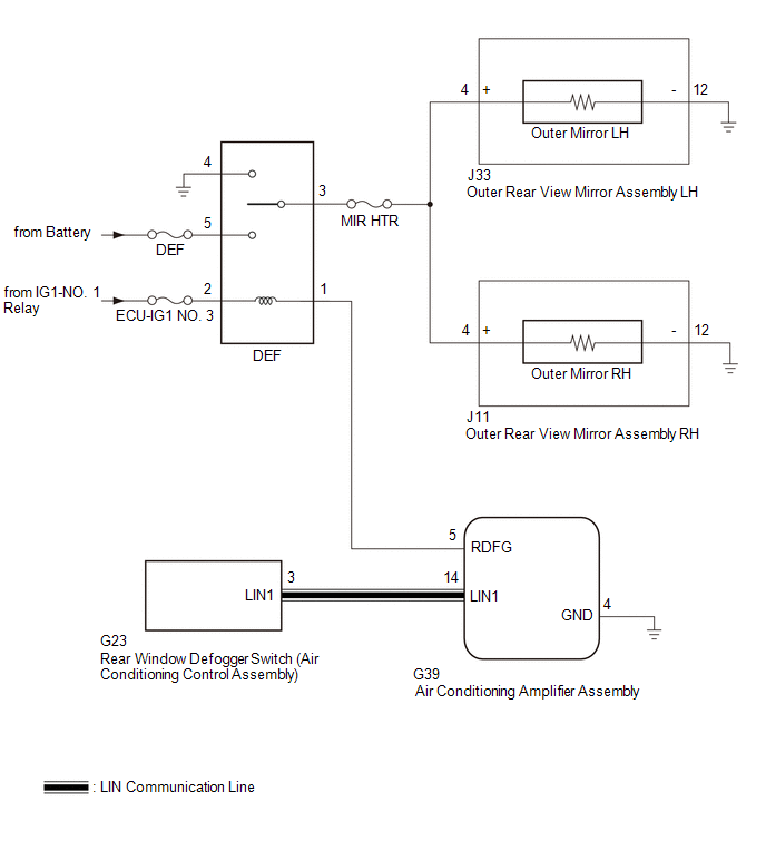 When the mirror heater switch (rear window defogger switch) on the air conditioning control assembly is pressed, the operation signal is sent to the air conditioning amplifier assembly via LIN communication. When the air conditioning amplifier assembly receives the signal, it turns on the DEF relay to operate the mirror heaters.