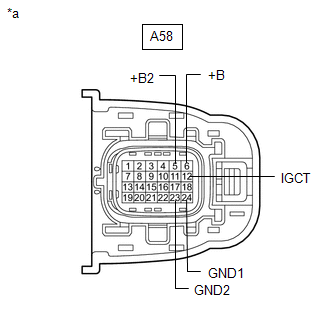 | A58-12 (IGCT) - Body ground | Power switch on (IG) | 11 to 14 V |