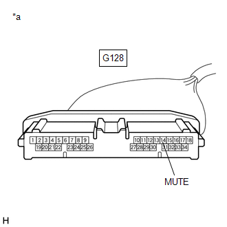 | (b) Measure the voltage according to the value(s) in the table below. Standard Voltage: | Tester Connection | Condition | Specified Condition | | G128-14 (MUTE) - Body ground | Power switch on (ACC) | 2.0 V or higher | | | | *a | Front view of wire harness connector (to DCM (Telematics Transceiver)) | | |