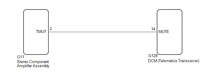 | (a) Measure the voltage according to the value(s) in the table below. Standard Voltage: | Tester Connection | Condition | Specified Condition | | G128-14 (MUTE) - Body ground | Power switch on (ACC), audio system playing → Emergency call mode | 2.0 V or higher → Below 1 V | | | | *a | Component with harness connected (DCM (Telematics Transceiver)) | | |