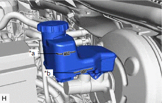 | (a) Check the fluid level. Brake Fluid: SAE J1703 or FMVSS No. 116 DOT3 SAE J1704 or FMVSS No. 116 DOT4 NOTICE: If using a dropper to adjust the fluid amount, make sure that the dropper has not been used with mineral oils, water or deteriorated brake fluid. Sealed areas may deteriorate and lead to fluid leaks, or the fluid may deteriorate and lead to decreased efficiency. HINT: -