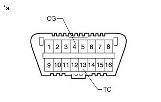 | (1) Using SST, connect terminals 13 (TC) and 4 (CG) of the DLC3. SST: 09843-18040 NOTICE: Confirm the terminal numbers before connecting them. Connecting the wrong terminals may damage electrical components. |