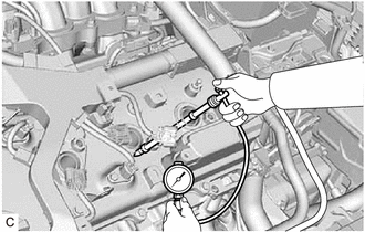 | (d) Check the cylinder compression pressure. (1) Insert a compression gauge into the spark plug hole. (2) Connect the Techstream to the DLC3. (3) Turn the engine switch on (IG). (4) Turn the Techstream on. (5) Enter the following menus: Powertrain / Engine / Active Test / Check the Cylinder Compression / Start. Powertrain > Engine > Active Test