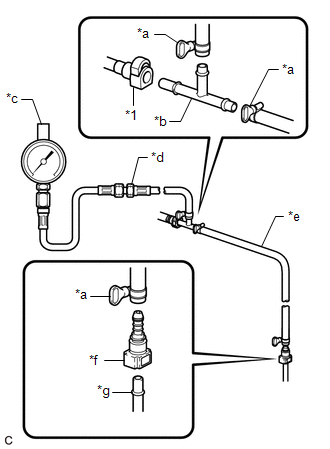 | (g) Install SST (EFI fuel pressure gauge) as shown in the illustration. SST: 09268-45101 09268-41250 09268-41260 09268-41280 09268-41500 09268-41700 95336-08070 |