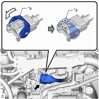 | (l) Disengage the claw and raise the lock lever to disconnect the No. 6 engine wire connector as shown in the illustration. NOTICE: Perform this step in order to stop fuel injection and prevent damage to the catalyst due to unburned fuel. |
