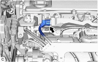 | (m) Disconnect the No. 5 engine wire connector. NOTICE: Perform this step in order to stop fuel injection and prevent damage to the catalyst due to unburned fuel. |