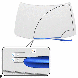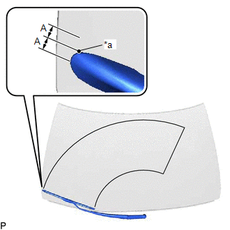 | (b) for LH Side (1) Operate the windshield wiper motor assembly. (2) Stop the windshield wiper motor assembly operation. (3) Check the automatic stop (park) position. HINT: After the front wiper motor is stopped, check the automatic stop position after lifting the wiper blade 2 times. Standard Clearance: | Area | Measurement | | A | 7.5 mm (0.295 in.) | OK: The front wiper stops at the position shown in the illustration. | |