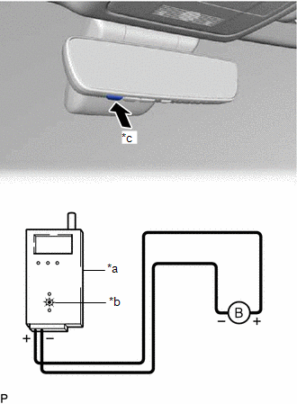 | (b) Apply battery voltage to the "HomeLink" tester as shown in the illustration. | | | *a | "HomeLink" Tester | | *b | Red LED | | *c | Press | | |
