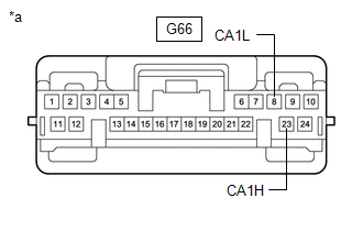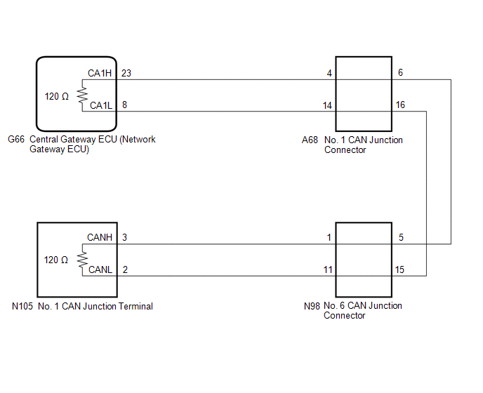 | Resistance between terminals 23 (CA1H) and 8 (CA1L) of the central gateway ECU (network gateway ECU) is 70 Ω or higher. |
