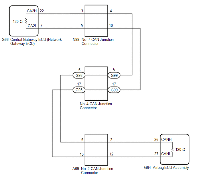 | Resistance between terminals 22 (CA2H) and 7 (CA2L) of the central gateway ECU (network gateway ECU) is 70 Ω or higher. |