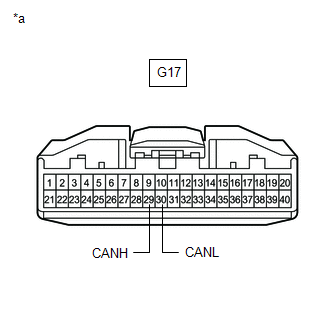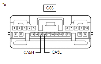 | Resistance between terminals 15 (CA5H) and 16 (CA5L) of the central gateway ECU (network gateway ECU) is 70 Ω or higher. |