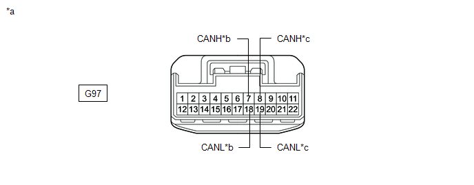 | G97-8 (CANH) - G97-19 (CANL) | Cable disconnected from negative (-) battery terminal | 108 to 132 Ω | Combination meter assembly |
