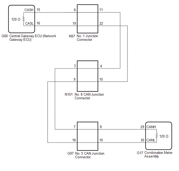 | N101-3 (CANH) - N101-9 (CANL) | Cable disconnected from negative (-) battery terminal | 108 to 132 Ω | No. 5 CAN junction connector |