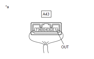 | A43-1 (OUT) - Body ground | Stop light switch assembly off (Brake pedal released) | 1.5 V or less |