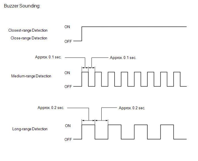 | Longest-range detection Approximately 1000 +/- 110 to 650 +/- 60 mm (39.4 +/- 4.33 to 25.6 +/- 2.36 in.) | Buzzer: Sounds intermittently (ON: 0.2 seconds / OFF: 0.5 seconds) Color of bars displayed: Yellow (Illuminated) | Wall |