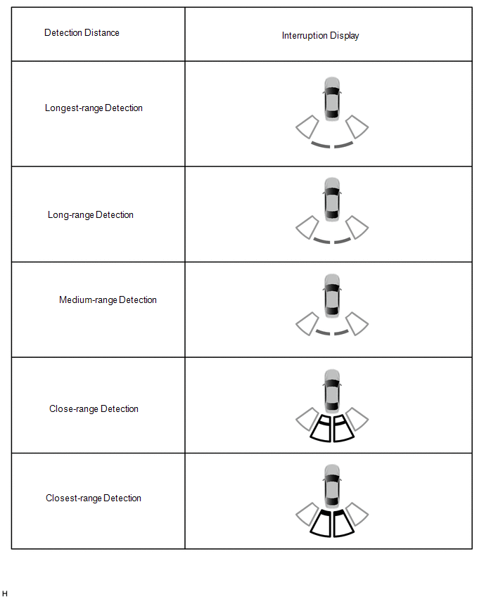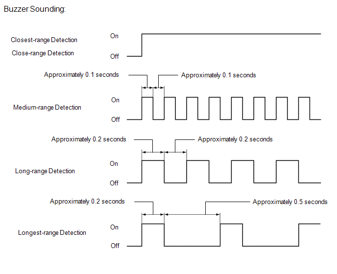 (1) When a rear center ultrasonic sensor (rear center sensor) has detected an obstacle, the displays and that the buzzer sounds.