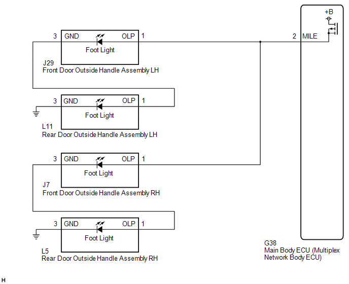 The main body ECU (multiplex network body ECU) controls the outside handle foot lights.