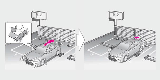■If the Parking Support Brake function (static objects) operates unnecessarily, such as at a railroad crossing In the event that the Parking Support Brake function (static objects) operates unnecessarily, such as at a railroad crossing, brake control will be canceled after approximately 2 seconds, allowing you to proceed forward and leave the area, brake control can also be canceled by depressing the brake pedal. Depressing the accelerator pedal after brake control is canceled will allow you to proceed forward and leave the area.