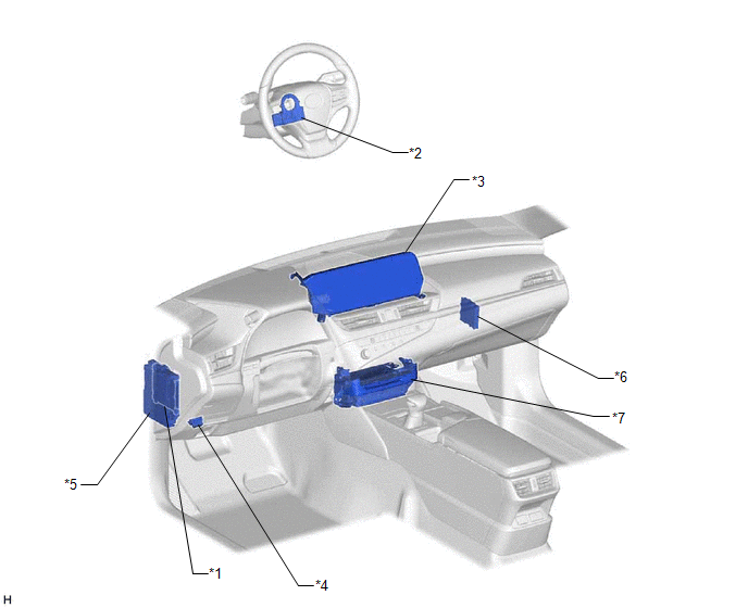 | *5 | INSTRUMENT PANEL JUNCTION BLOCK ASSEMBLY - ECU-IG1 NO. 2 FUSE - ECU-DCC NO. 1 FUSE - IG1-NO. 1 RELAY - BKUP LP RELAY (for 8 inch display) | *6 | CLEARANCE WARNING ECU ASSEMBLY (w/ Parking Support Alert System) |