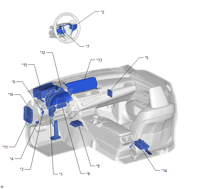 | *9 | AIRBAG SENSOR ASSEMBLY - YAW RATE AND ACCELERATION SENSOR | *10 | MAIN BODY ECU (MULTIPLEX NETWORK BODY ECU) |