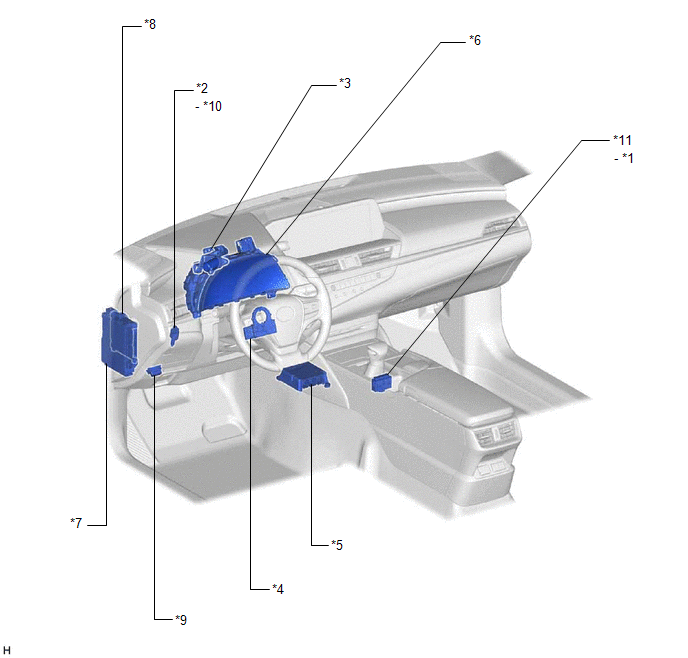 | *7 | INSTRUMENT PANEL JUNCTION BLOCK ASSEMBLY - ECU-IG1 NO. 2 FUSE - ECU-DCC NO. 1 FUSE - A/BAG-IG2 FUSE - STOP FUSE | *8 | MAIN BODY ECU (MULTIPLEX NETWORK BODY ECU) |