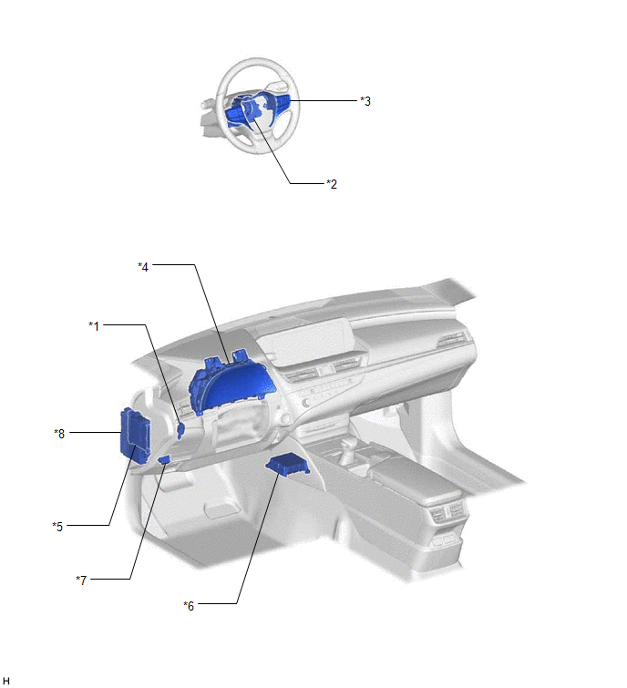 | *1 | STOP LIGHT SWITCH ASSEMBLY | *2 | SPIRAL CABLE WITH SENSOR SUB-ASSEMBLY - SPIRAL CABLE SUB-ASSEMBLY - STEERING SENSOR |