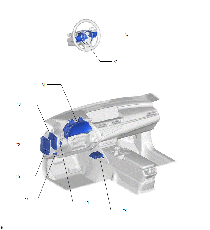 | *1 | STOP LIGHT SWITCH ASSEMBLY | *2 | SPIRAL CABLE WITH SENSOR SUB-ASSEMBLY - SPIRAL CABLE SUB-ASSEMBLY - STEERING SENSOR |