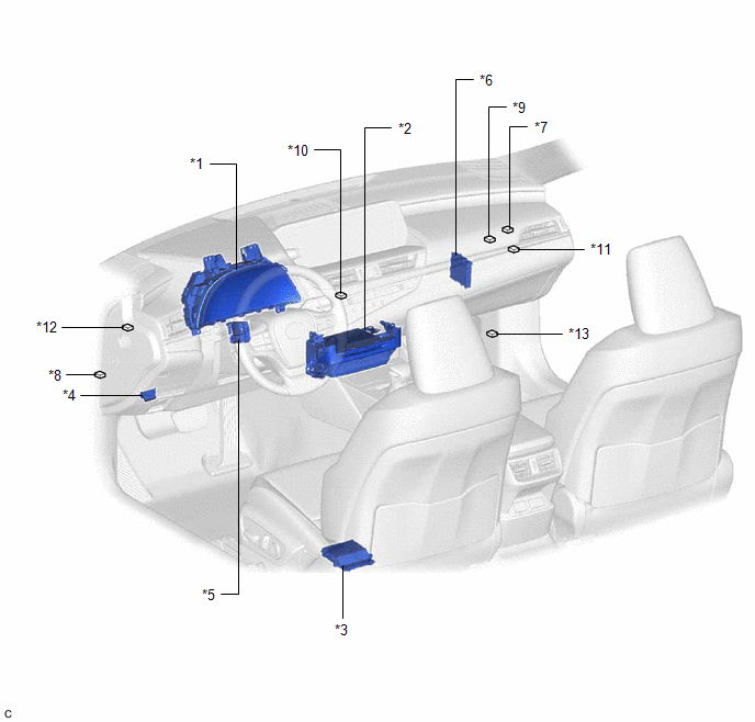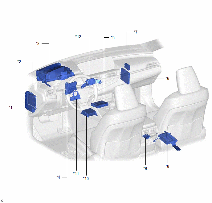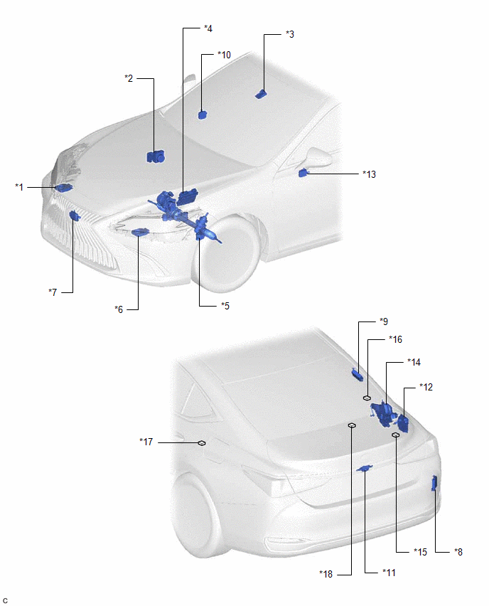 | *11 | REAR TELEVISION CAMERA ASSEMBLY | *12 | ABSORBER CONTROL ECU (w/ AVS System) |