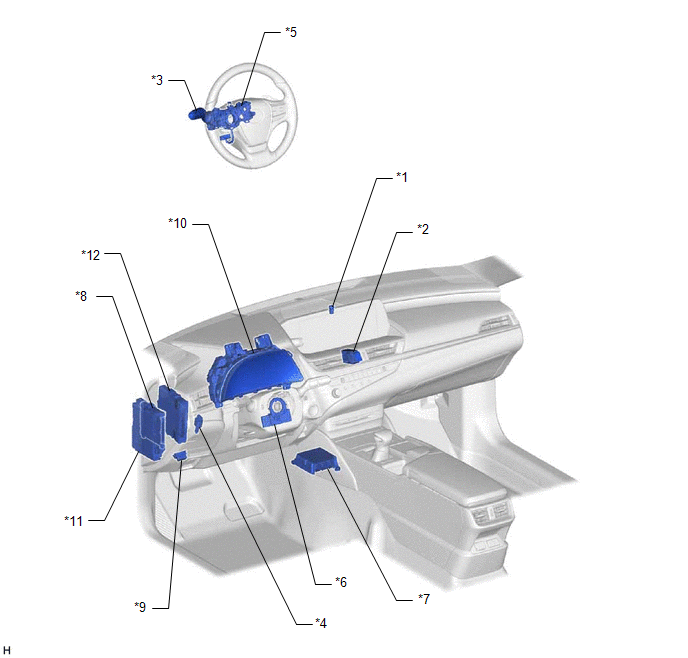 | *11 | INSTRUMENT PANEL JUNCTION BLOCK ASSEMBLY - TAIL RELAY - BKUP LP RELAY - TAIL FUSE - BKUP LP FUSE - ECU-IG1 NO. 3 FUSE - ECU-DCC NO. 2 FUSE - HAZ FUSE - METER-IG2 FUSE - STOP FUSE | *12 | HYBRID VEHICLE CONTROL ECU |