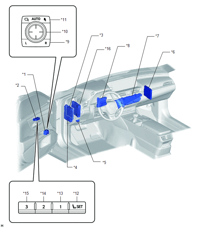 | *1 | OUTER MIRROR SWITCH ASSEMBLY | *2 | SEAT MEMORY SWITCH |