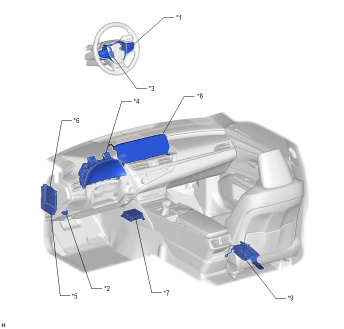| *7 | AIRBAG SENSOR ASSEMBLY - YAW RATE AND ACCELERATION SENSOR | *8 | MULTI-DISPLAY ASSEMBLY |